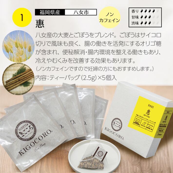 「惠」は国産の大麦とごぼうを使用した、香ばしいお茶。